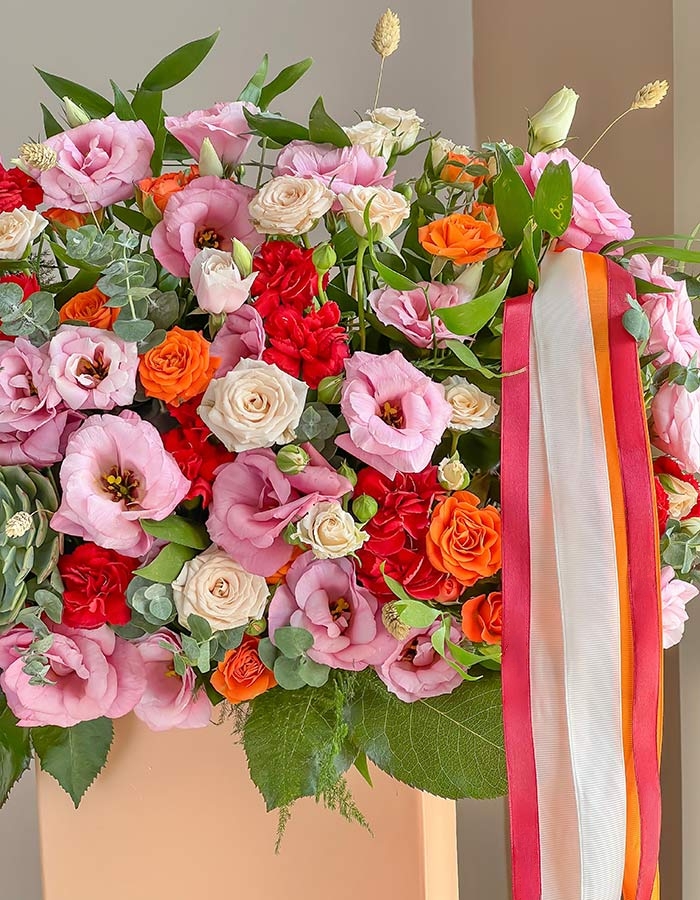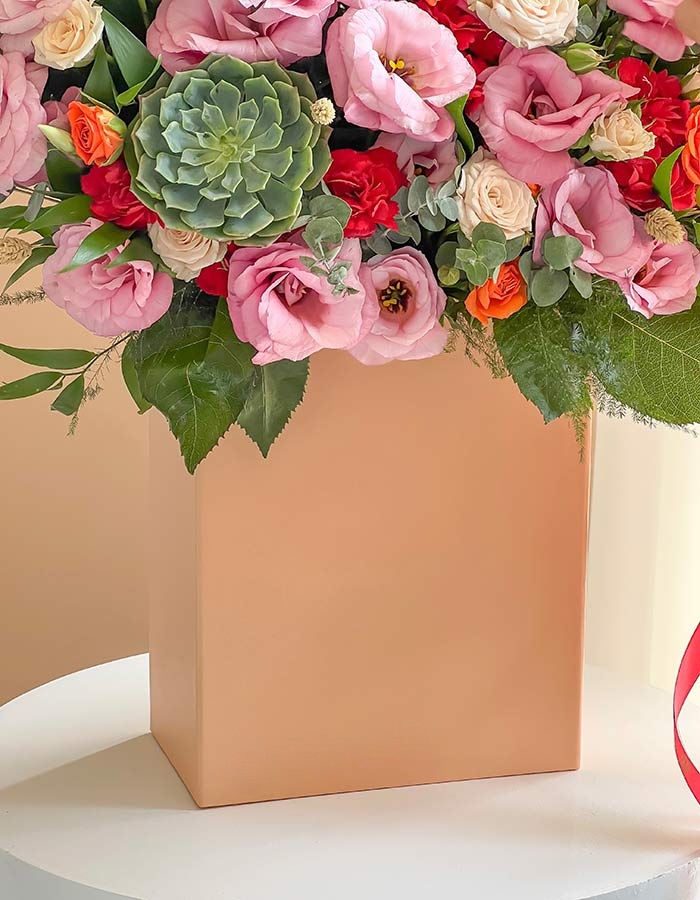 در طراحی این باکس گل از گلهای تازه، خوشعطر و باکیفیت استفاده شده است که با دقت و سلیقه توسط تیم حرفهای گلآرایی شدهاند. گلهایی مانند رز مینیاتوری،لیسین،میخک در رنگبندیهای خاص و چشمنواز در کنار هم قرار گرفتهاند تا جلوهای لوکس و دلنشین خلق کنند.