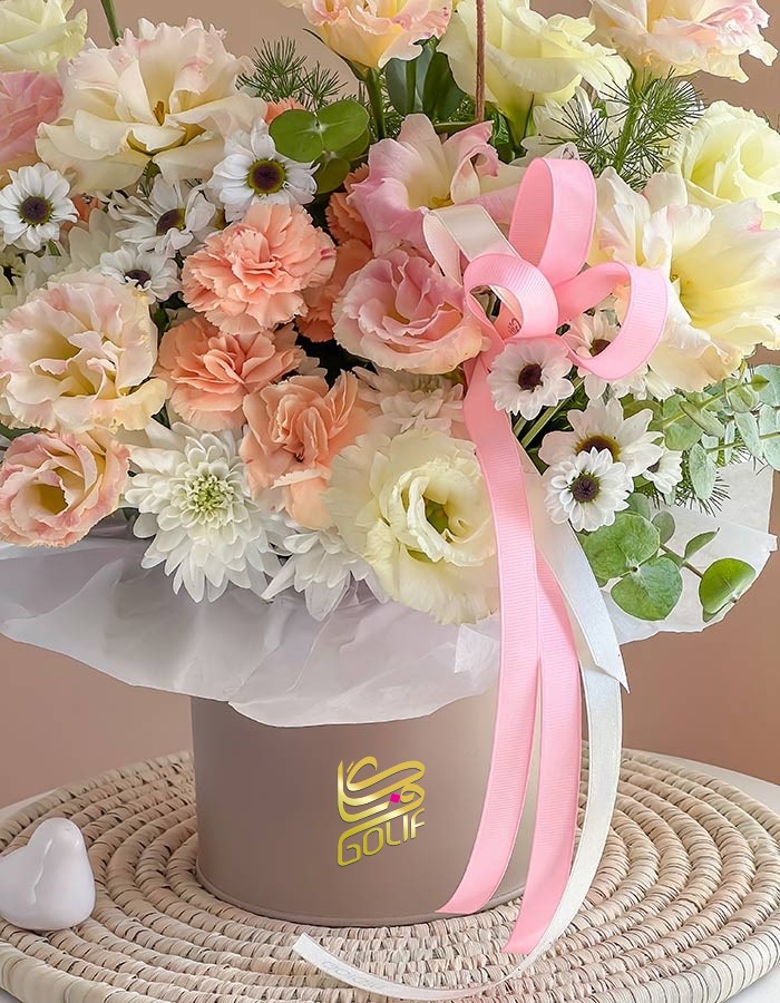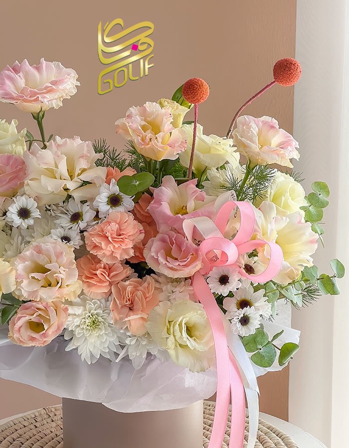 در طراحی این باکس گل از گلهای تازه، خوشعطر و باکیفیت استفاده شده است که با دقت و سلیقه توسط تیم حرفهای گلآرایی شدهاند. گلهایی مانند لیسین شامپاینی،لیسین،داوودی در رنگبندیهای خاص و چشمنواز در کنار هم قرار گرفتهاند تا جلوهای لوکس و دلنشین خلق کنند.