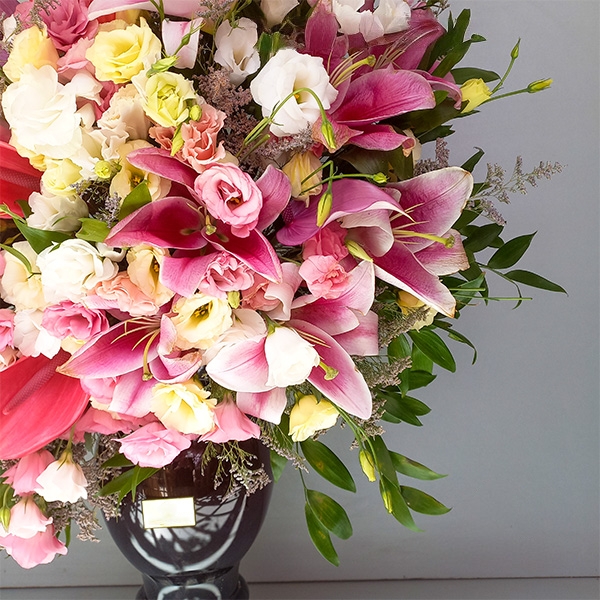 در طراحی این جام گل از گلهای تازه، خوشعطر و باکیفیت استفاده شده است که با دقت و سلیقه توسط تیم حرفهای گلآرایی شدهاند. گلهایی مانند رز،آنتوریوم،لیلیوم،لیسینتوس در رنگبندیهای خاص و چشمنواز در کنار هم قرار گرفتهاند تا جلوهای لوکس و دلنشین خلق کنند.
